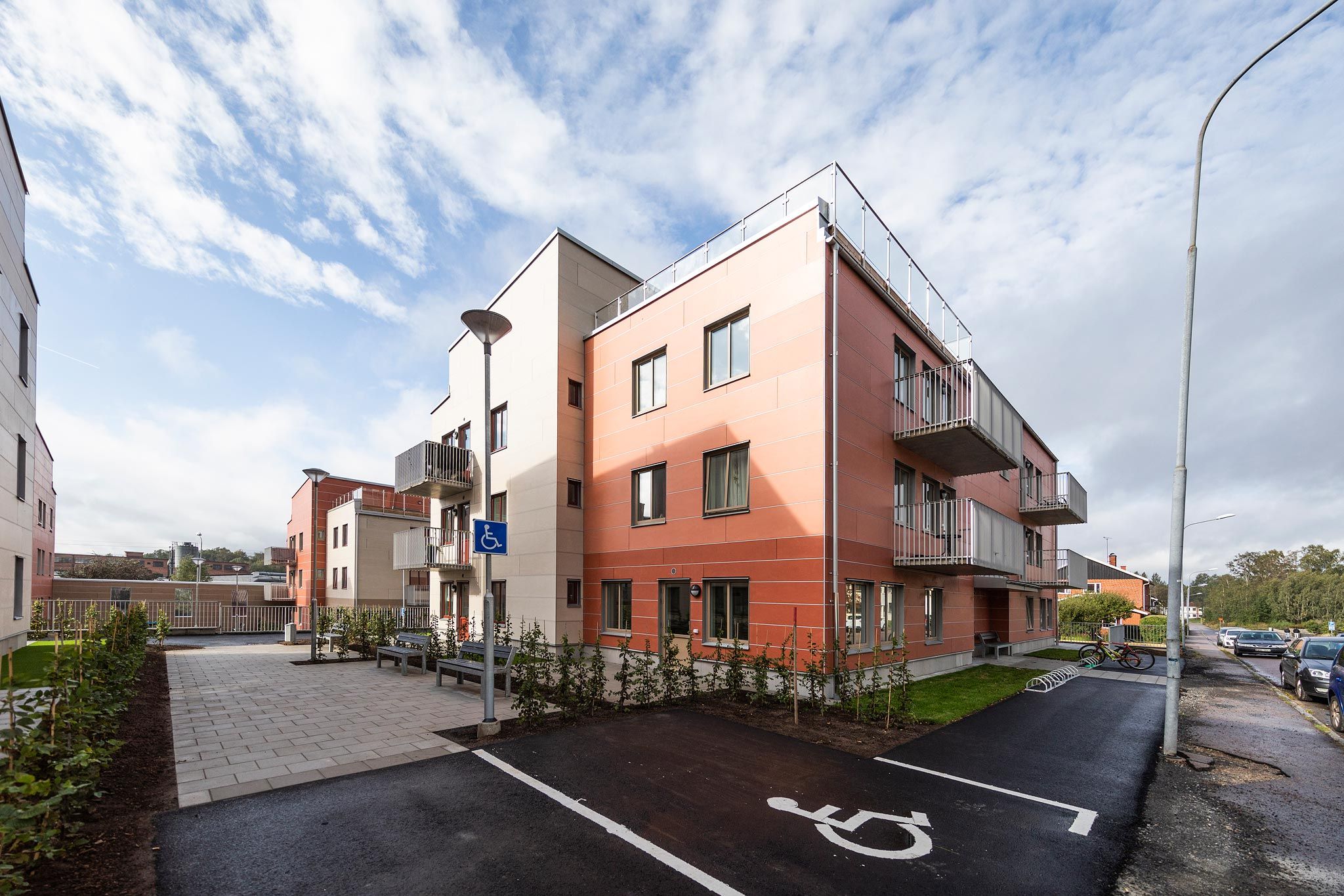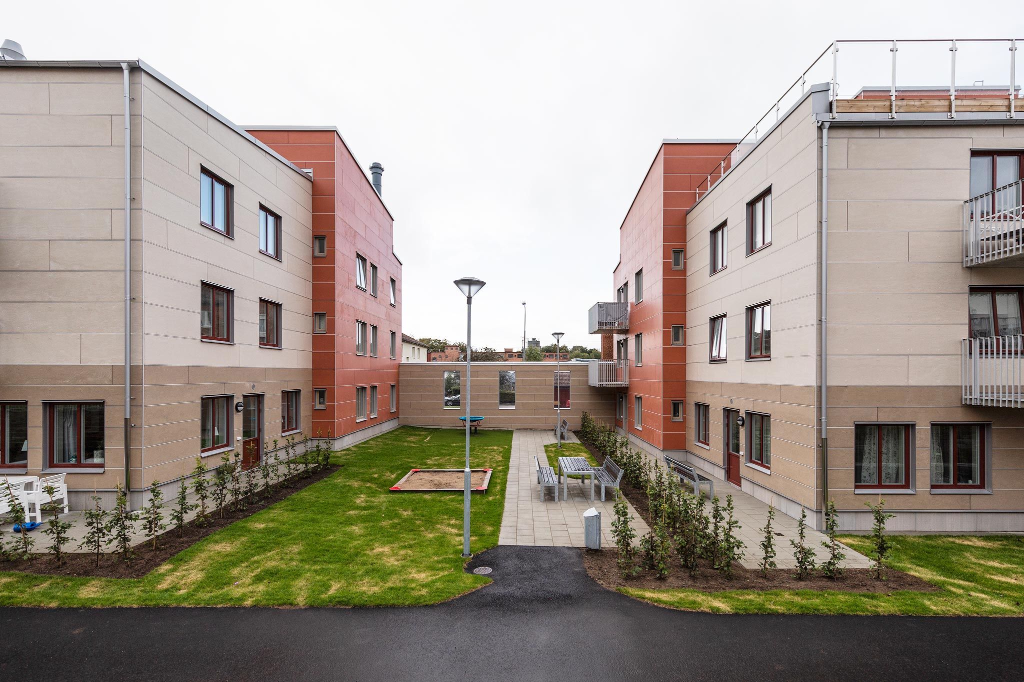 Flerbostadhus fördelade på fyra huskroppar i ett av Älmhults centrala kvarter. Husen är utförda i tre våningar med vind. Samtliga lägenheter har ljus i två väderstreck och balkong eller privat uteplats. Dessutom finns en stor, gemensam takterrass på varje hustak och ytor för samvaro på innergården. Innergården är fint terrasserad med hjälp av stödmurar som skapar spännande rum och bidrar till tillgängliga entréer.